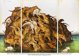 BENTONVILLE, ARK.- Crystal Bridges Museum of American Art has acquired a major new work by Walton Ford, an artist winning international acclaim for his highly detailed, monumental watercolors of exotic birds, reptiles and mammals. In 'The Island', Ford presents a writhing pyramidal mass of Tasmanian wolves (thylacines) grappling with each other and a few doomed lambs. The violent extermination of the thylacines, which were hunted to extinction in the early 20th century, calls into question who is hunter and hunted in this savage tableau